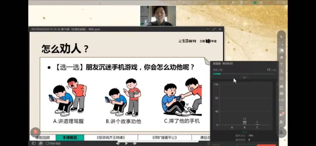 读《师旷撞晋平公》,在讲到师旷用琴撞向晋平公的时候,胡老师直接让学员们来了一场口才上的正面交锋。不是嫌光读课文干巴巴嘛?不如亲自感受一下如何“暴力”进谏才能达成目的。