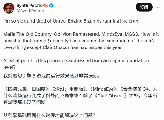“我们已经受够了虚幻5引擎游戏垃圾的运行表现!”