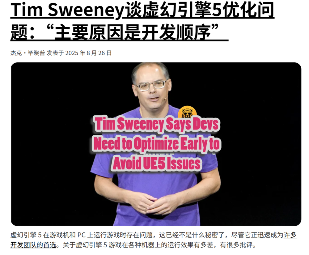 在接受媒体采访时,蒂姆·斯威尼指出如今许多虚幻5游戏性能拉胯的核心原因在于:优化得太晚。太多团队习惯于先疯狂堆画质,瞄准顶配PC开发,直到最后才匆匆做优化和低配适配——结果就是首发翻车、帧数爆炸、玩家骂街。