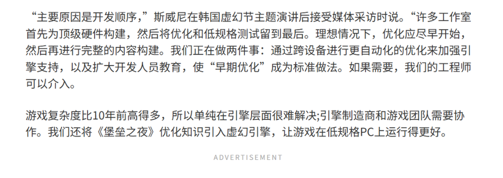 斯威尼这则“甩锅”发言一石激起千层浪,同时也被不少人质疑是在转移火力,问题确实有但究其原因是你们玩家电脑不够强,只要你能加钱换高端配置就不需要开发商辛辛苦苦优化了。