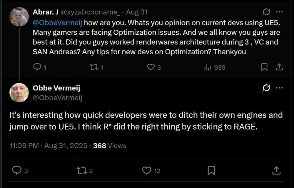 曾参与《GTA:圣安地列斯》《GTA:罪恶都市》等经典作品的开发的前R星开发者Obbe Vermeij,最近接受采访,对此次虚幻5引擎争议发表了自己的看法。
