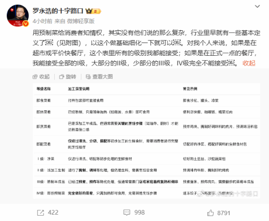 当晚,罗永浩再次就预制菜话题发表看法,认为保障消费者知情权在实际操作中并不像部分人所说的那样复杂。他表示,餐饮行业内部早已存在一些基础性的分类共识,只需在此基础上进一步细化和完善即可实现信息透明。