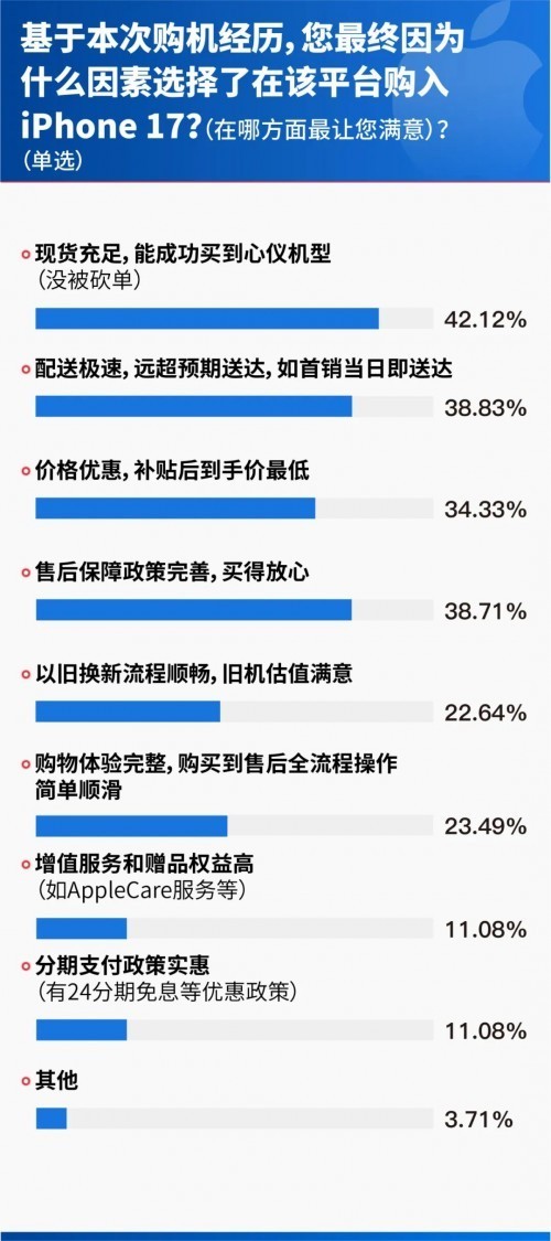 报告指出,“确定性现货”是苹果新机首发期“最大王牌”。货源不确定性成为用户选择渠道的最直接考量因素之一。在选择平台时,“现货充足,能成功买到心仪机型”是用户最看重的因素(42.12%)。京东拥有规模现货优势,一定程度上有效避免了其他平台频繁出现的“页面显示有货实际无货”或“支付后遭遇砍单”的糟糕体验(30.68%的用户担忧此问题)。