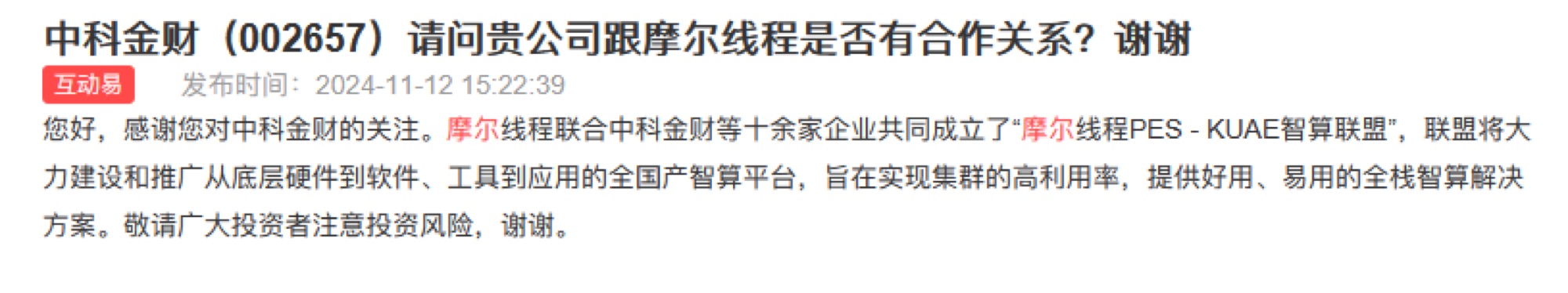 摩尔线程携手中科金财共建智算联盟