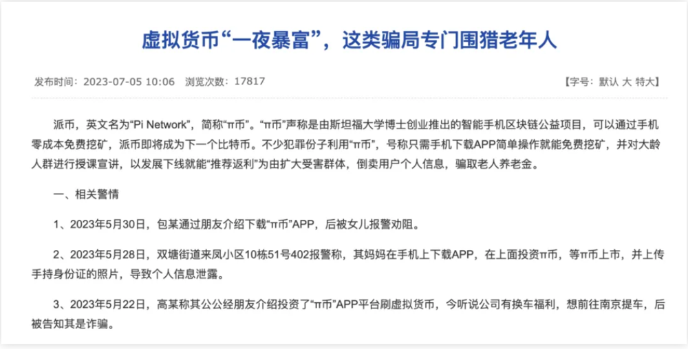 父母口中的发财狂热叙事,落在多数子女耳中几乎等于大事不妙。当心怀恐惧的子女上网一搜,发现Pi币因太像传销和诈骗遭多国监管质疑。早在2023年,无锡网上公安就曾发文称:Pi币骗局,专门围猎老年人。