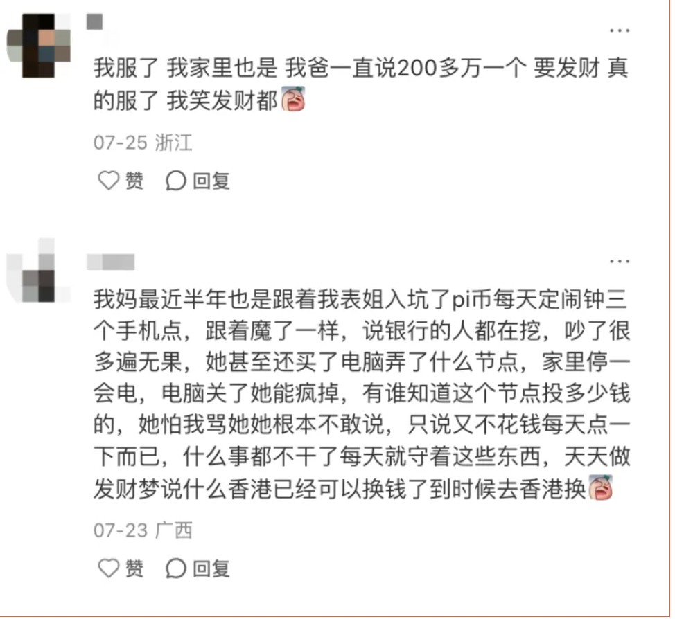 互联网上有无数子女和后辈的亲身经历证明,Pi币不会一夜暴富,只会让人精神失常。