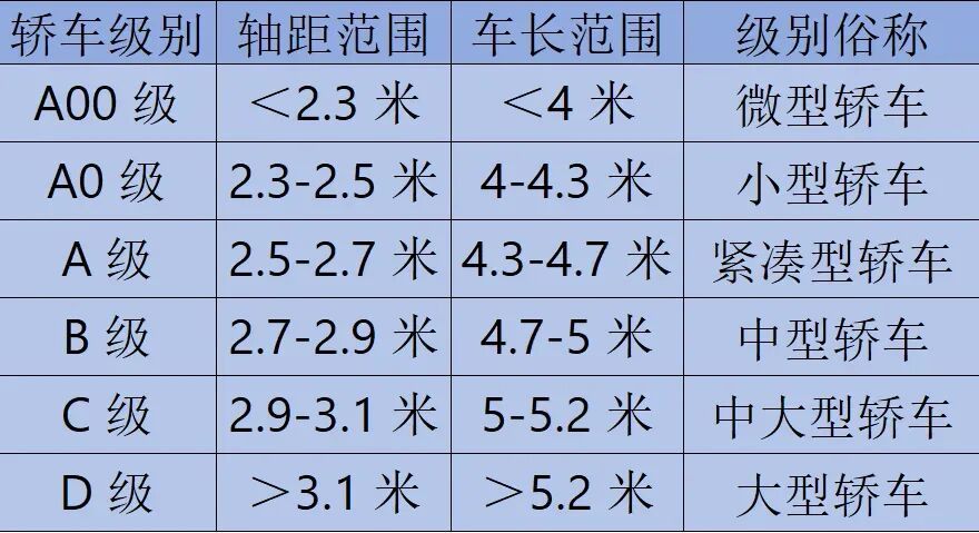 根据轴距、车身长度两大核心指标,轿车通常被分为六大类别。