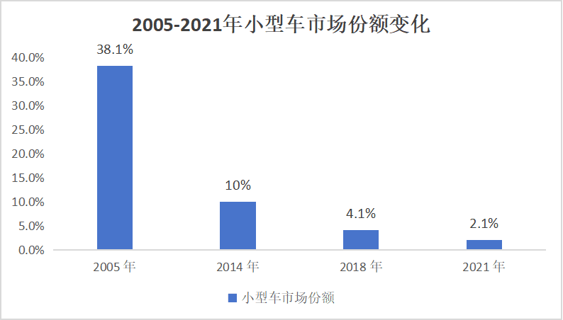 统计数据显示,2005年,小型车的市场份额高达38.1%,2014年跌到了10%,2018年又降至4.1%,2021年更是降至2.1%,达到历史最低点。