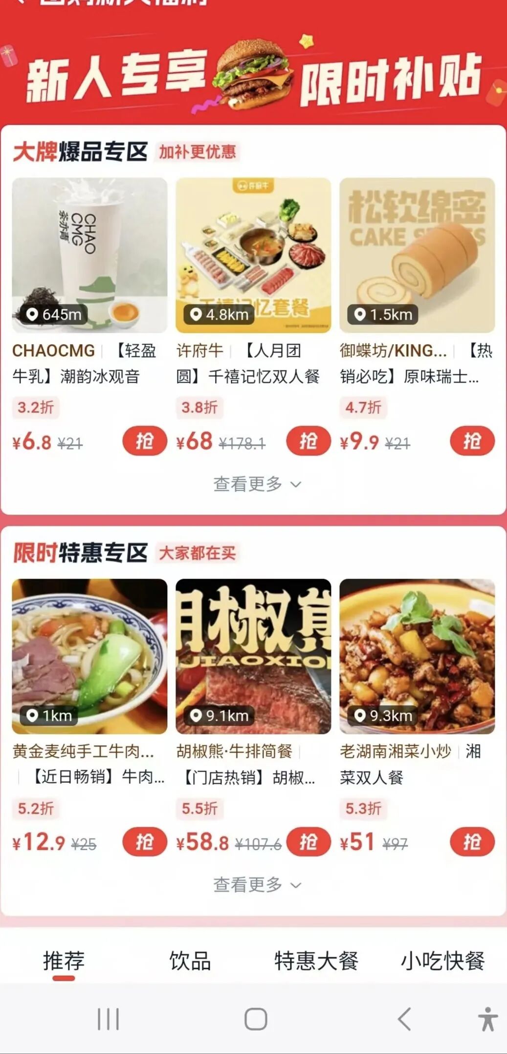 在价格策略上,淘宝闪购延续了即时零售领域的补贴打法。首批上线的套餐折扣力度惊人:许府牛双人餐原价170元团购价68元,青花椒烤鱼套餐直降54元。这种补贴不仅针对消费者,也向商家端倾斜,平台提供的专项补贴帮助商家降低了参与门槛。