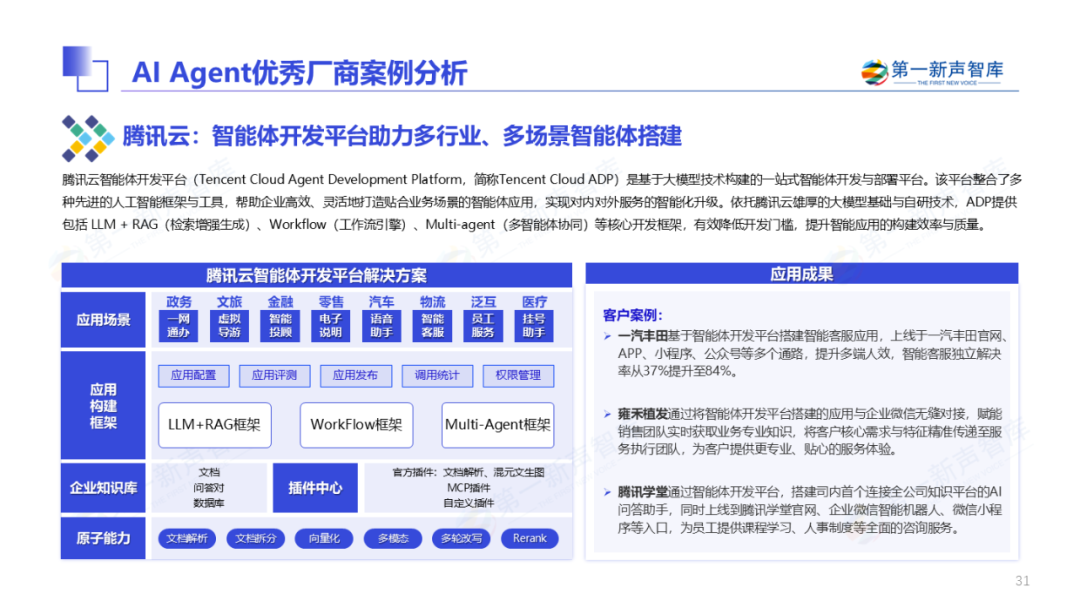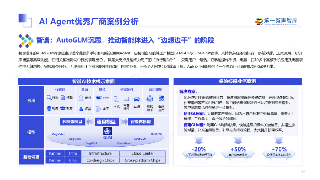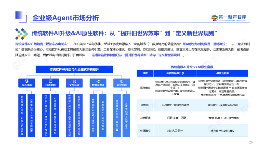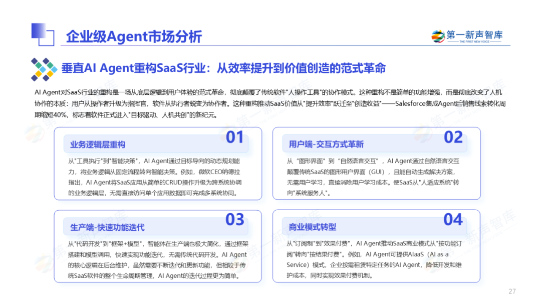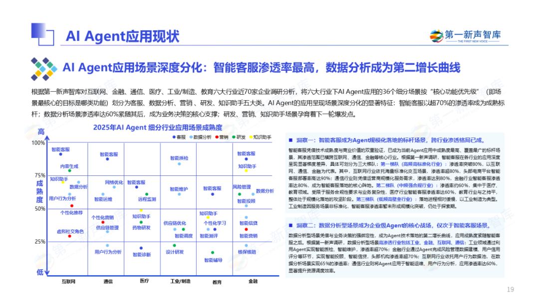 在行业应用层面,AI Agent的价值释放与行业数字化基础、数据成熟度高度相关。AI Agent正在多个关键领域实现从“辅助工具”到“核心驱动”的角色转变。根据第一新声智库研究,AI Agent已走出试验阶段,其应用深度与行业数字化基础高度相关,并在金融、通信等数据密集型行业中率先形成规模价值。