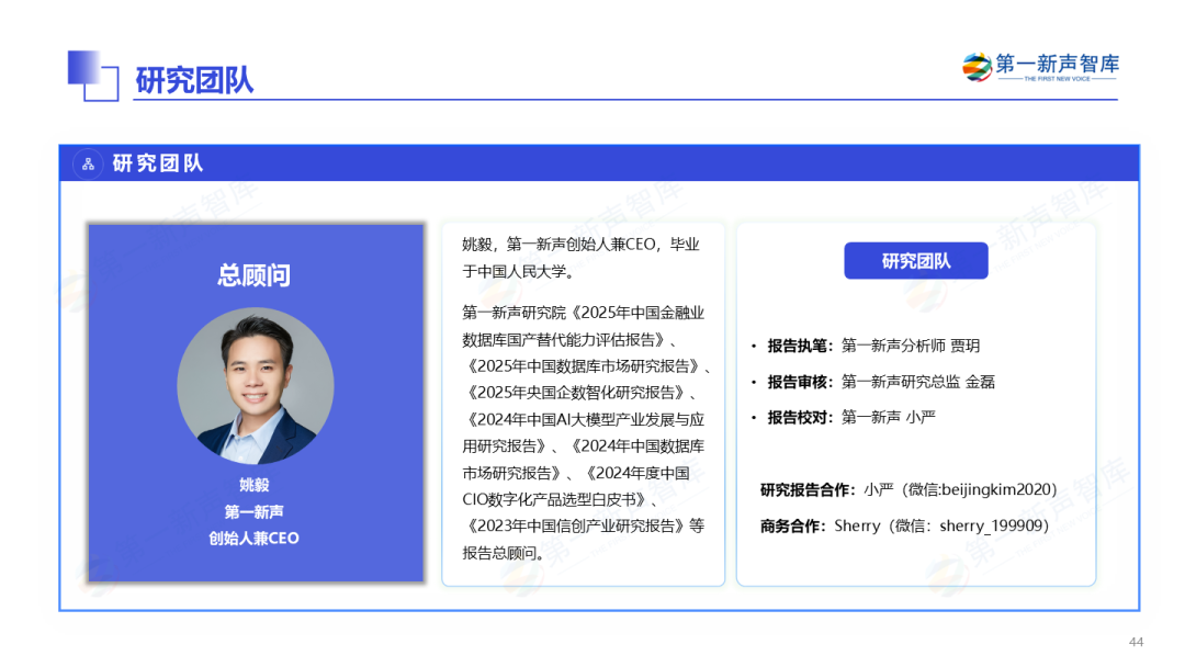 第一新声智库已经连续4年追踪中国AI产业的发展及应用,当前已累计18轮、问卷调研及专家访谈超700次,访谈了包括金融、制造、零售等众多行业的专家,进行多个主题研究,已经陆续公开发布了《2024年中国AI大模型产业发展与应用研究报告》、《2024年中国AI大模型市场需求深度研究报告》(非公开)、《大模型时代-2025年央国企数智化转型新实践与新范式》等众多重磅研究成果。