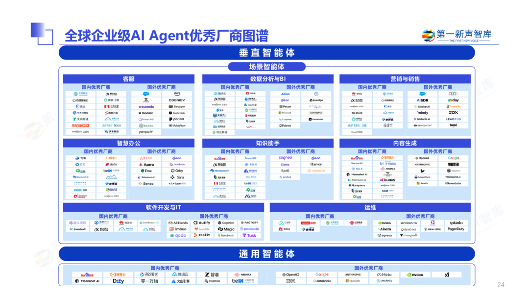 从应用场景维度来看,AI Agent正在客服、数据分析与BI、营销与销售、智慧办公、内容生成、知识助手、软件开发与IT、运维八大场景中发挥关键作用。