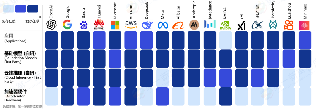 全球人工智能核心企业在价值链四大环节(应用层、基础模型层、云端推理层、加速器硬件层)的布局呈现显著分化特征:作为全球AI领军企业的OpenAI,在应用层、基础模型层及云端推理层保持领先优势,但在加速器硬件环节依赖外部供应,存在明显能力短板;谷歌则实现四大环节深度全覆盖,垂直整合能力凸显;国内多家公司与国外微软、亚马逊均已达成四大环节全链条布局,具备端到端技术落地能力。
