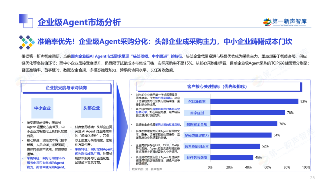 根据第一新声智库调研,从核心采购指标看,目前企业级Agent采购的TOP6关键因素分别是:召回准确率、首字延时、数据安全合规、多模态推理能力、跨系统协同水平、长任务收敛度。