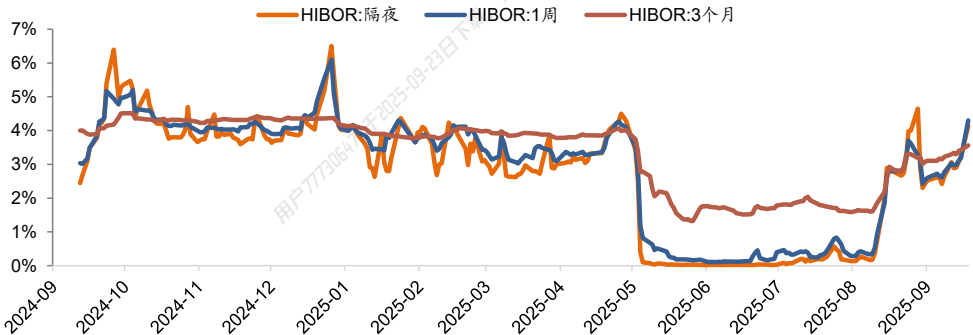 香港市场利率再次出现短暂抬头迹象。隔夜Hibor为3.25%,3个月Hibor利率3.43%,环比快速上行。