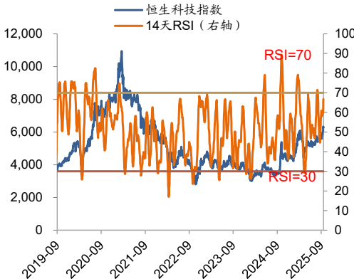 市场情绪指标RSI目前位于中性区间。恒生指数RSI为64.5,恒生科技指数RSI为66.8,尚未进入超买区间,表明市场仍有上行空间。