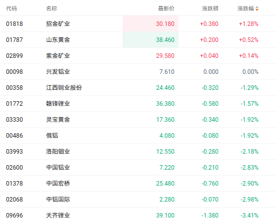 除了以上个股走强之外,同为有色金属股的洛阳钼业(03993.HK)在今日盘中一度涨近3%,目前已转跌。
