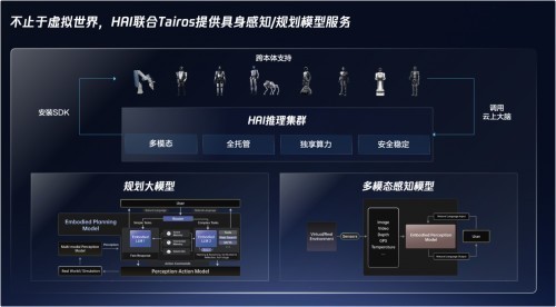 机器人正在成为AI发展落地的重要方向,但具身智能也面临着显著挑战。一方面,具身智能缺乏大语言模型所具备的天然、开放、海量的数据,而具身数据和硬件高度绑定,对数据质量的要求极高;另一方面具身智能依赖的多模态感知,需要整合图像、文字、声音甚至触感等多元信息,实现综合交互的作用。腾讯依云通过HAI推理集群联合自研具身智能产品Tairos,提供具身感知与规划模型服务,以“多模态、全托管、独享算力、安全稳定”为核心特性,为机械臂、人形机器人等设备打造专属、跨本体的“云上大脑”。
