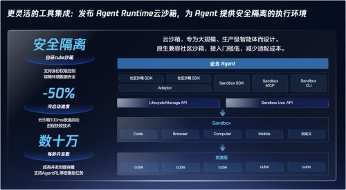 在工具集成层面,腾讯云智算全新发布Agent Runtime云沙箱,为Agent提供安全隔离的执行环境。Agent Runtime脱胎于腾讯云原生已有的体系,实现Infra服务的极致无缝化。它能快速创建运行环境,支撑大规模Agent应用落地;它将基建运维做到“极致无感”,用户无需关注底层资源调度逻辑,计算资源会按需“凭空出现”,完成任务后自动释放,全程无需手动开关机或配置环境。