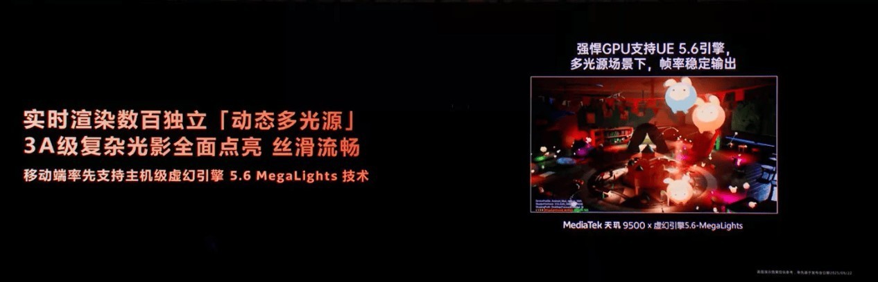 ✨ **主机级光追与UE生态的移动融合**: 天玑9500在移动端首发支持主机级Raytracing Pipeline独立管线,光追渲染性能相较上一代提升119%,并率先与《暗区突围》合作落地120帧光追手游体验。同时,它也是首个支持虚幻引擎5.5 Nanite和5.6 MegaLights的旗舰平台,支持千万量级几何模型实时渲染和数百个光源,为移动游戏带来了电影级的空间质感和丰富的视觉细节。