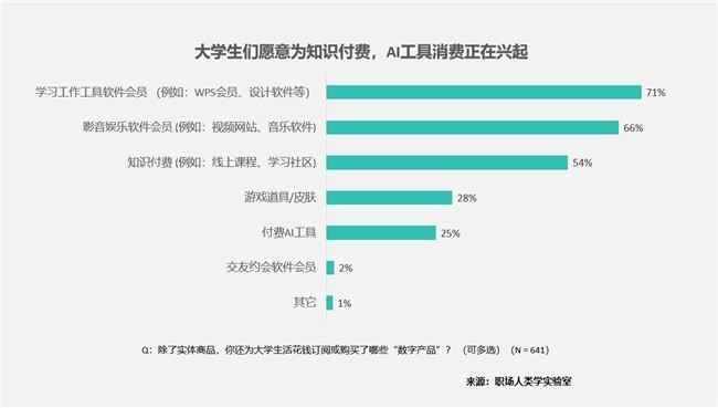 ✈️ 旅游体验成为情绪消费首选,知识付费与AI探索并行:大学生在追求情绪价值时,更倾向于“真实体验”。旅游以84%的压倒性优势成为情绪消费的最大出口,远超潮玩和追星。同时,知识消费成为刚需,71%的学生付费购买工具软件会员,54%购买知识付费课程。值得注意的是,已有25%的大学生购买付费AI工具,显示出他们对利用新技术辅助学习和成长的强烈意愿。