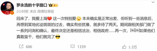 9月22日,罗永浩通过社交平台发文称已返回上海,并表达对上海的感情,称“我爱上海”。他在文中就近期的“跑路”传言作出回应,强调此次行程仅为常规出差,并无特殊原因。同日早些时候,有网民猜测其IP地址将在三个月内无法恢复至内地状态,并以此发起赌约。罗永浩转发该言论并表示愿意应战,以此间接澄清并无长期离境计划。