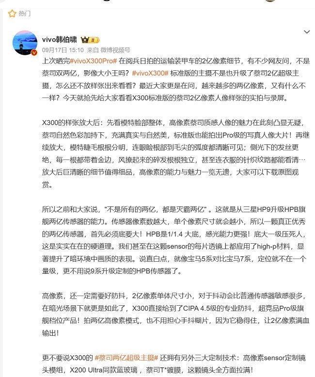 二、4000-5000元价位段:专业影像,舞台摄影师的首选vivo X300系列还有vivo X 300标准版,vivo产品经理韩伯啸介绍称:“vivo X300 2亿像素单体尺寸小,对于抖动会比普通传感器敏感很多,在暗光场景下就更是如此了,X300直接给到了CIPA 4.5级的专业防抖,超竞品Pro级旗舰档位产品!拍两亿高像素模式,也不用担心手抖糊片,因为它稳得住,让2亿像素满血输出!”同样旗舰配置,但价格预估4299元起,更适合预算有限,但又需要旗舰拍照需求的用户购买。
