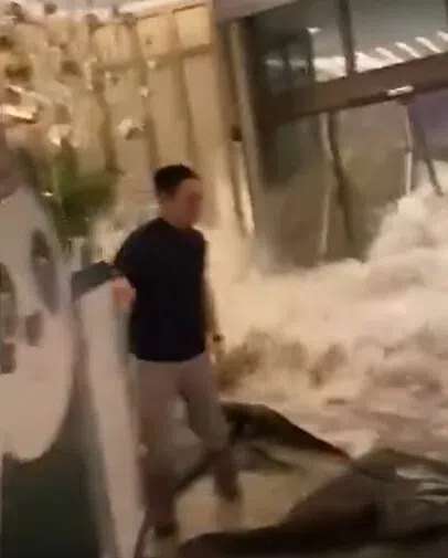 香港富丽敦海洋公园酒店的玻璃大门星期三早上碎裂,大量泥水不断涌入酒店大堂。 (视频截图)超强台风“桦加沙”即将登陆,香港多处出现海水倒灌,有酒店大门被水冲破。