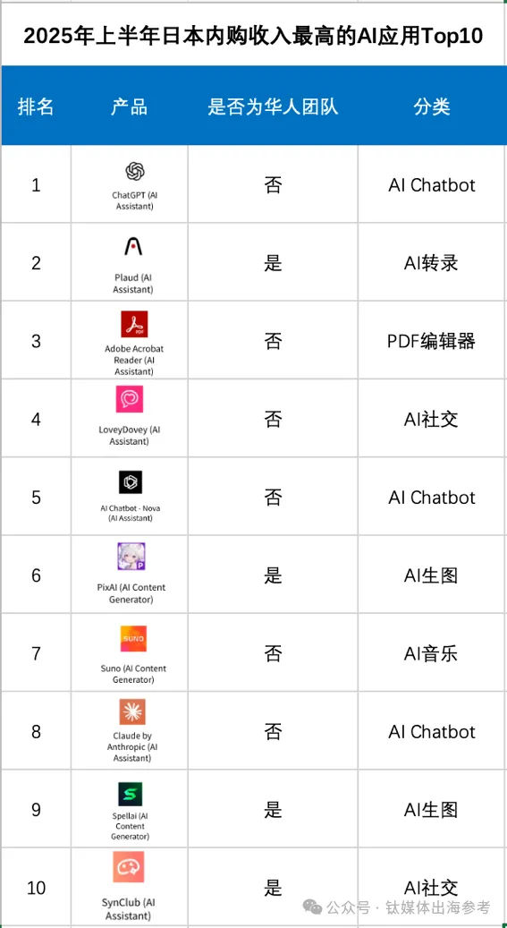 2、上半年日本最赚钱的AI产品Top10,近一半来自中国