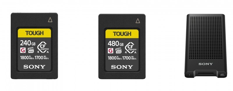 索尼高速、大容量CFexpress Type A存储卡CEA-G240T(左) ,CEA-G480T(中)和CFexpress Type A 读卡器MRW-G3(右)