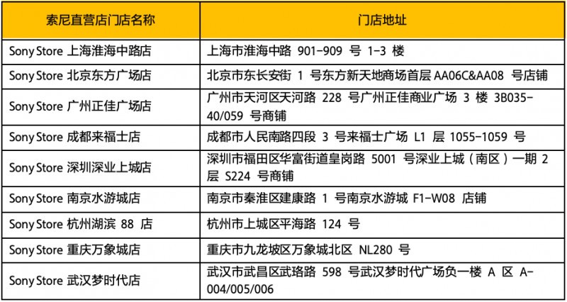 更多实时动态,敬请关注索尼中国在线商城、索尼影像圈官方微博或索尼中国微信公众号(微信号:sonycn_001)和索尼影像圈官方微信公众号(微信号:sonycn_002)或垂询以下门店。
