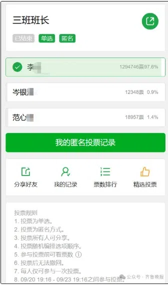 一个“三班班长”投选的小程序在微信上刷屏,吸引了超过百万网民投票。(齐鲁晚报微信号) 有网民调侃“谁说中国没有选票?”