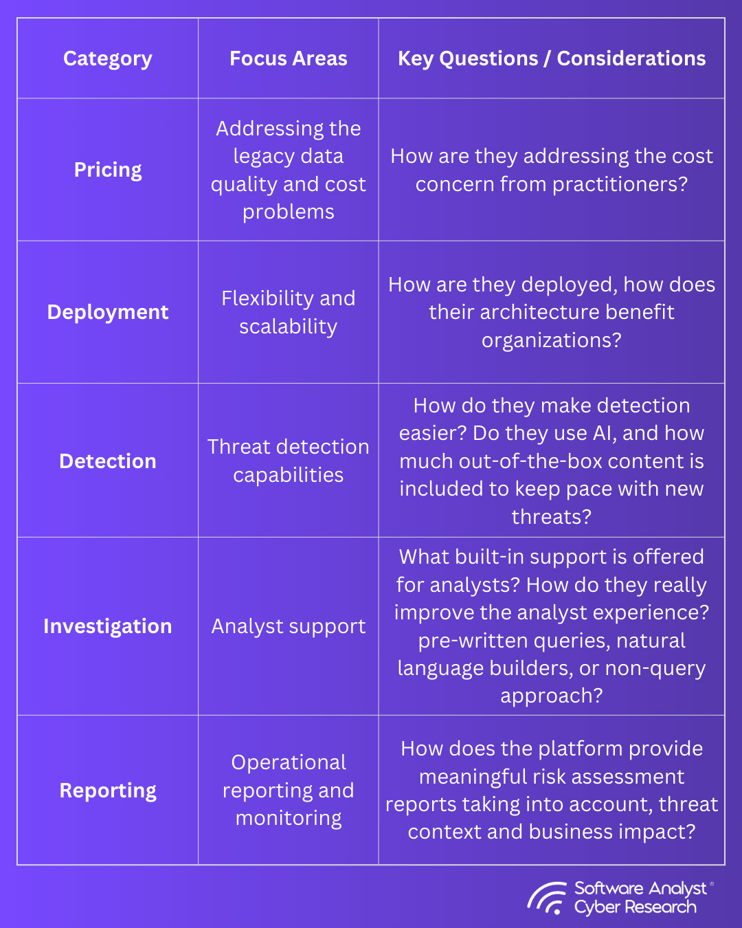 To evaluate how these SIEM vendors are addressing the concerns from legacy SIEM approaches, we built a structured assessment process grounded in real operational needs and use cases. Each platform was measured against a broad set of criteria covering the most important functional, technical, and operational aspects of SIEM.