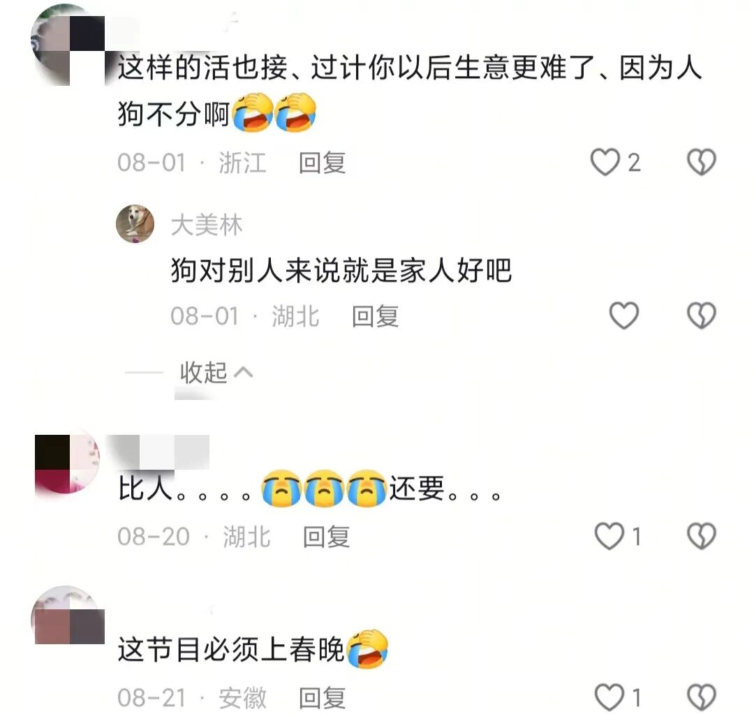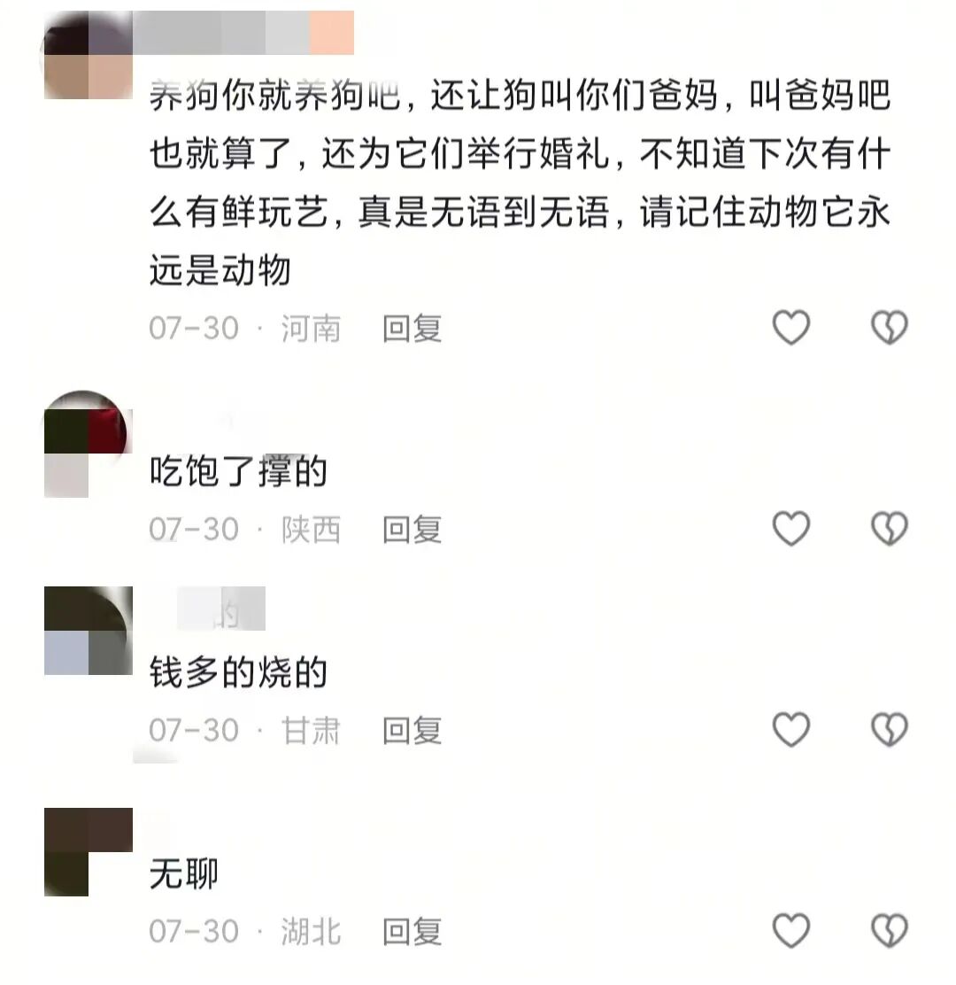 有人送出祝福与赞美,认为“这是给‘家人’最好的爱”;也有人表达不解与质疑,直呼“看不懂”;还有人嘲讽宠物主人吃饱了撑的、人狗不分,甚至抨击李力啥钱都挣,“这样的活都接,以后只能给狗当司仪了!”
