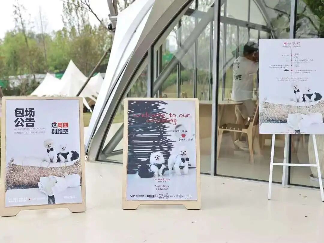 两只“新狗”的婚礼在一家五星酒店的草坪上举行。婚礼现场被布置得美轮美奂,到场的狗狗用它们的狗爪拍到签到墙上,仪式感拉满。