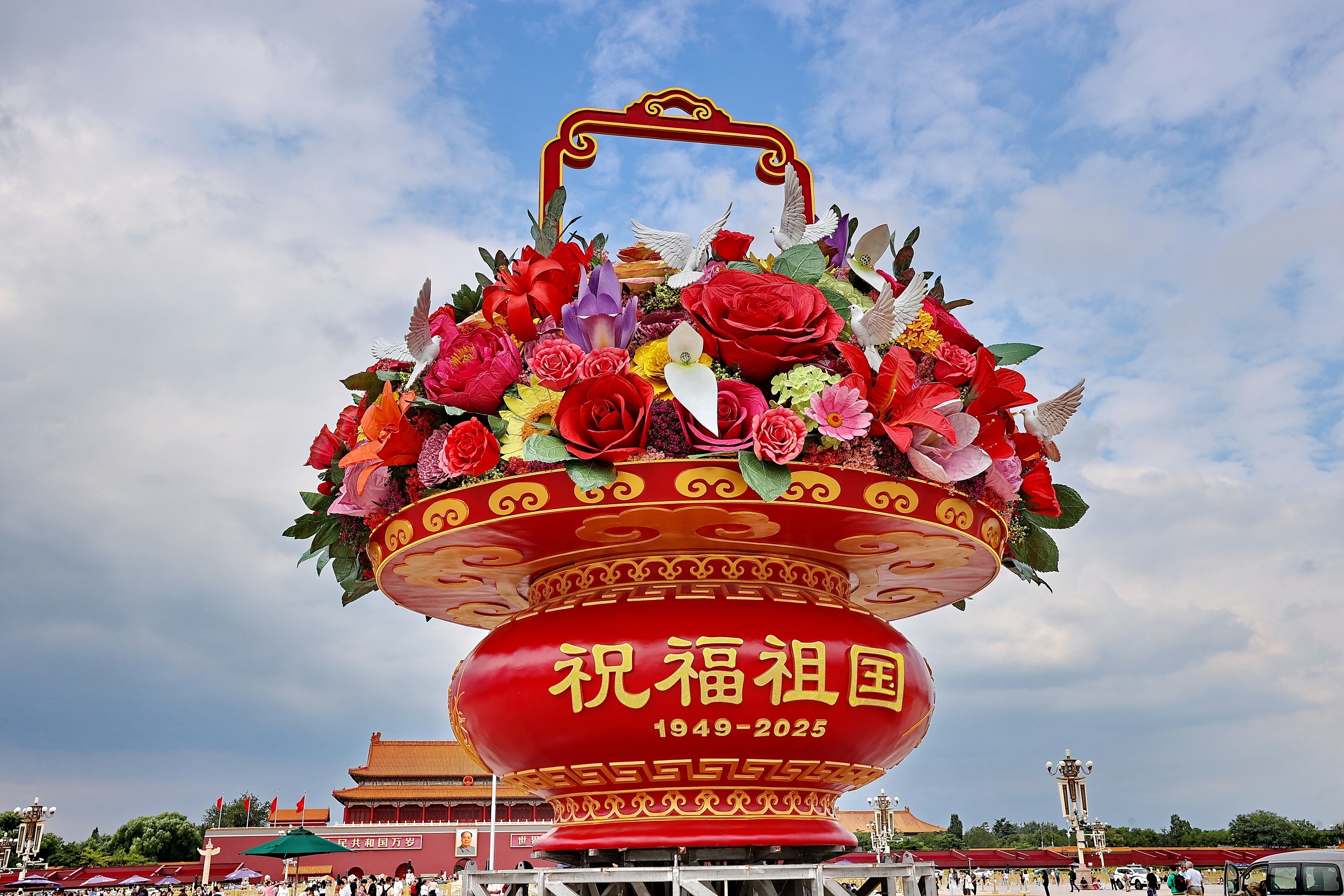 北京天安门广场迎接建国76周年「祝福祖国」巨型花篮亮相。9月22日,天安门广场2025年国庆花坛正式搭建完成,这座立体花坛高18米,直径12米,装饰元素包括荷花、月季、珙桐、橄榄枝、向日葵、山丹等代表美好寓意的花卉,表达对祖国繁荣富强、世界和平发展的美好祝福。2025年中国国庆假期为10月1日至8日,中国国家铁路集团预计国庆假期全国铁路发送旅客将达到2.19亿人次,日均计划开行旅客列车约1.3万列。摄影师:iDaily Media