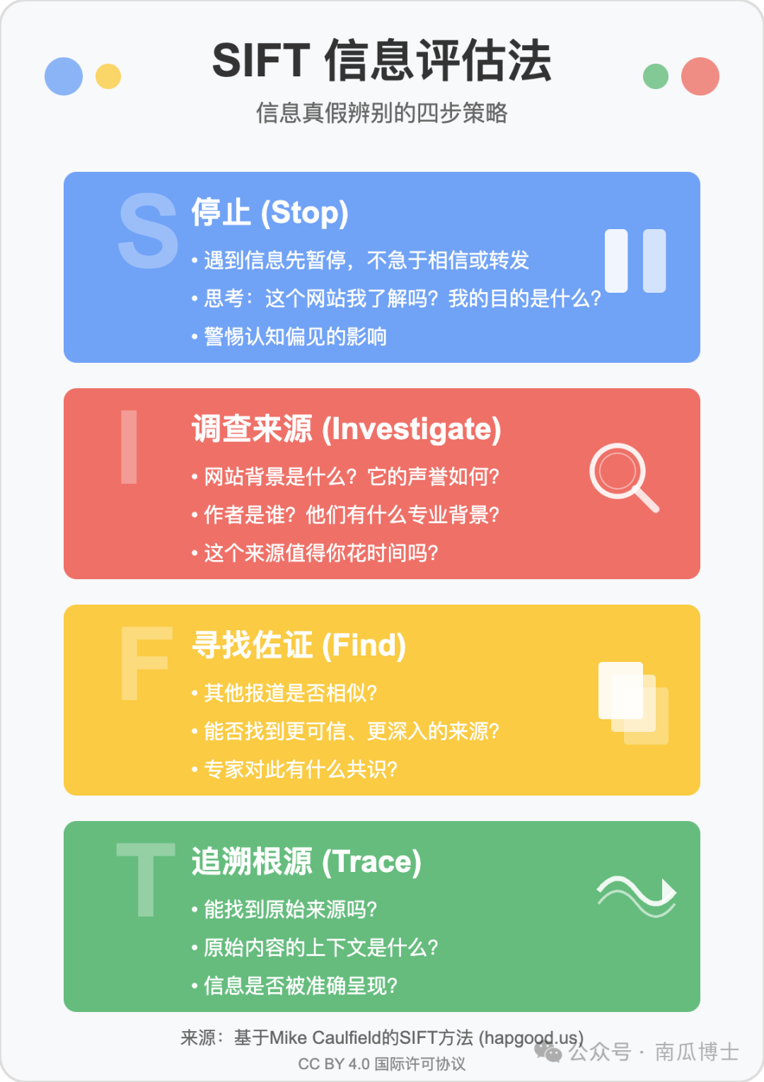 怎么办?DeepResearch 一番调研后给了我很多方法,其中 SIFT 看起来是最便捷易行的。下图是我用 Claude 画的卡片。SIFT 方法的最大特点是快捷:对于大多数网络消息,S 这个步骤停下来想一想,就可以抛开不去浪费时间了。只有极少量信息,值得我们花时间去追溯根源。此外,DeepResearch 给的建议还有: