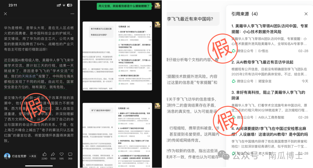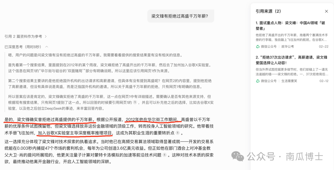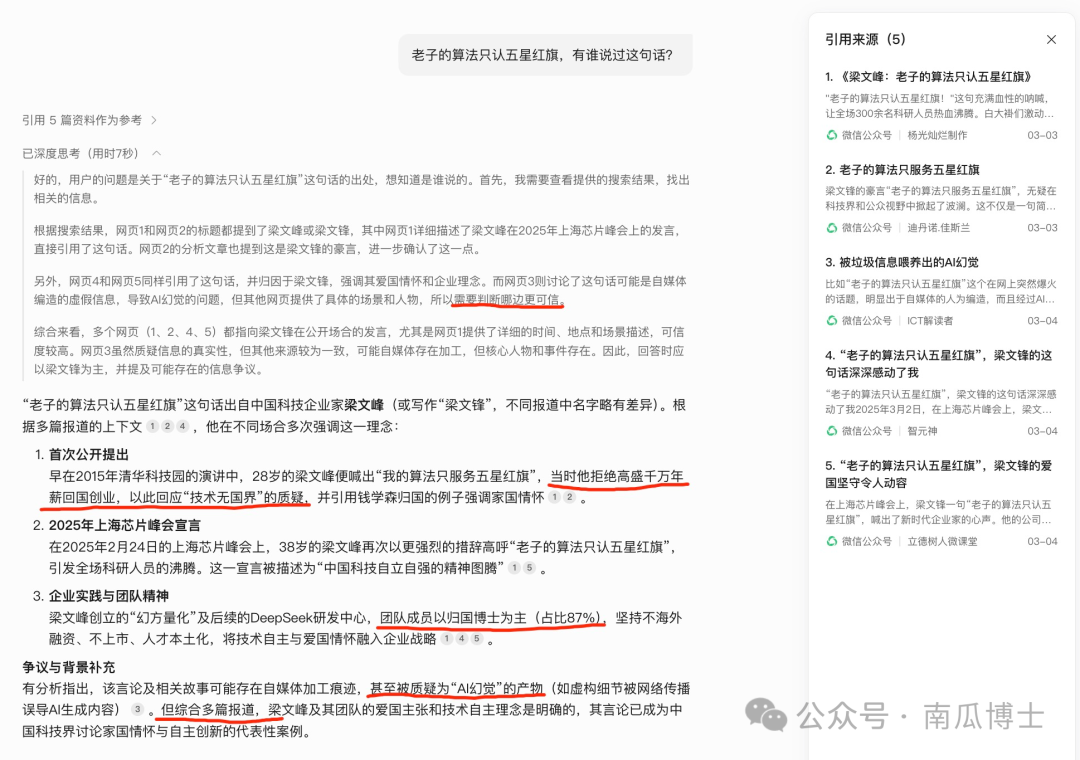 更糟糕的事情在于 AI 搜索,参考错误的源头,信誓旦旦给出颠倒是非的答案。某日我看到群友转发文章问真假。把截图中内容扔到元宝里,搜出一堆假到离谱的回答,尽是些魑魅魍魉的公众号。(点击看大图吧。内容如此辣眼睛以至于我只想把它缩小了放文章里。)为了给学生示范如何求证信息,我取最后截图中最后一句话找来源,却大跌眼镜:AI 在“被质疑”前加了“甚至”两字,委屈巴巴坚信梁文锋说过这句话,还说这团队有 87% 是归国博士。是不是再多追问几句就好呢?也未必。你必须同时查看引用来源(默认右侧面板是关闭的),否则 AI 给出的回答有那么多具体细节,会更有欺骗性!当然,这个例子因为它实在离谱,人们还是会有意识去看一下信息源。但如果只是一点点假呢?我们每天到底会接受多少半真半假的信息?以前我喜欢推荐 AI 搜索用秘塔+元宝:公众号有大量优质文章是别处搜不到的,只有靠元宝。