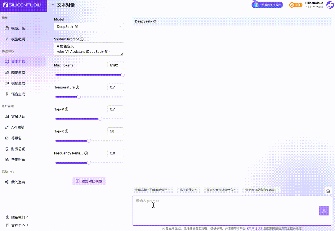除了 DeepSeek-R1、DeepSeek-V3,SiliconCloud 已上架包括 Janus-Pro-7B、CosyVoice2、QVQ-72B-Preview、DeepSeek-VL2、DeepSeek-V2.5-1210、Llama-3.3-70B-Instruct、HunyuanVideo、fish-speech-1.5、Qwen2.5-7B/14B/32B/72B、FLUX.1、InternLM2.5-20B-Chat、BCE、BGE、SenseVoice-Small、GLM-4-9B-Chat 在内的数十种开源大语言模型、图片/视频生成模型、语音模型、代码/数学模型以及向量与重排序模型。平台支持开发者自由对比、组合各种模态的大模型,为你的生成式 AI 应用选择最佳实践。 其中,Qwen2.5(7B)、Llama3.1(8B)等 20+ 大模型 API 免费使用,让开发者与产品经理无需担心研发阶段和大规模推广所带来的算力成本,实现“Token 自由”。其他人都在看