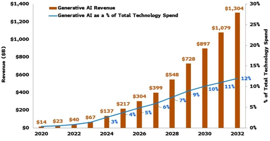 你认为这是夸大其词?全球生成式 AI 市场将在 2032 年达到 1.3 万亿美元,未来七年内增长超过 13 倍。[2]