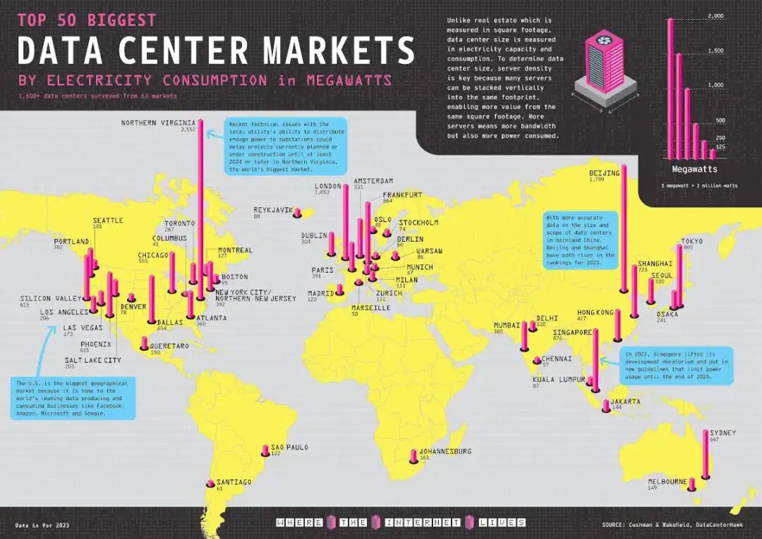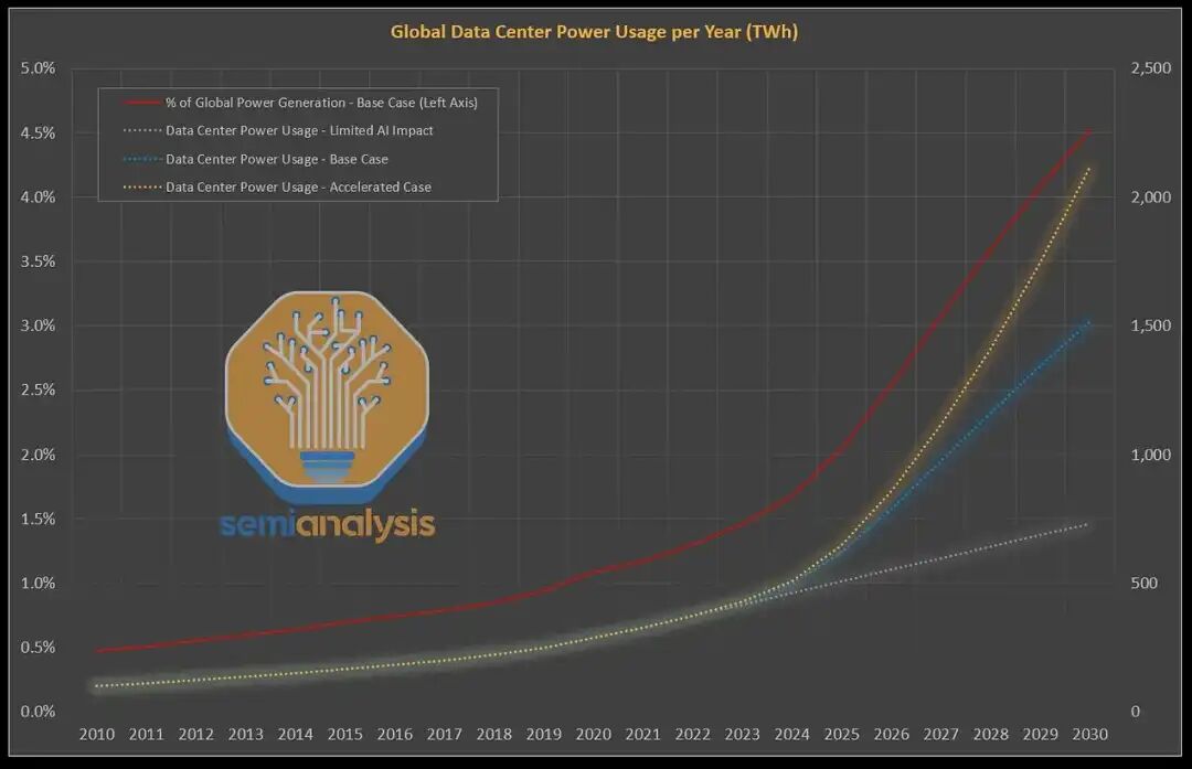 数据中心在很大程度上伴随着计算机和互联网的崛起而发展。我将简要探讨这些趋势的发展历史以及我们如何走到今天这一步。计算的早期版本与当今的数据中心相似:一台集中式计算机,旨在解决计算密集型且关键的任务。1.巨像(Colossus) - 由艾伦·图灵建造,用于破解恩尼格玛密码机的计算机。(注:图灵也被认为是人工智能和计算机科学的奠基人。他提出了图灵测试,作为检验人工智能是否真实的一种手段,而 ChatGPT 在去年通过了这一测试)。2.ENIAC - 由美国军方在二战期间设计,但直到1946年才完成的计算机。巨像机比ENIAC更早建造,但由于巨像机的机密性质,ENIAC常被视为第一台计算机。20世纪 50年代,IBM凭借大型机在计算机领域崛起并占据主导地位。这使得他们在接下来的数十年间在科技领域保持了统治地位,而AT&T则是当时另一家主导性的科技公司。ARPANET(高级研究计划署网络),于1969年推出,是为了连接美国日益增长的计算机数量而开发的。现在,它被认为是互联网的最早版本。由于这是一个政府项目,其最密集的连接区域集中在华盛顿特区周围。这便是北弗吉尼亚计算领域称霸的根源。每当新一代数据中心拔地而起,他们总希望利用现有的基础设施。而这一基础设施恰好位于北弗吉尼亚地区,至今依然如此!20世纪90年代,随着互联网的发展,我们迫切需要更多的物理基础设施来处理日益增长的海量网络数据。其中,数据中心作为互联节点应运而生。像AT&T这样的电信运营商早已铺设了通信基础设施,因此,向数据中心领域拓展对他们而言是顺理成章的事情。然而,这些电信公司与当今垂直整合的云服务提供商之间存在类似的竞合动态。AT&T不仅拥有通过其基础设施传输的数据,还拥有基础设施本身。因此,在容量有限的情况下,AT&T 会优先处理自己的数据。这种动态使得企业对其保持警惕,从而催生了Digital Realty和 Equinix等数据中心公司的崛起。数据中心在互联网泡沫期间获得了大量投资,但泡沫破裂后投资显著放缓(我们在推断数据时应牢记这一教训)。2006年,随着亚马逊网络服务的发布,数据中心开始扭转颓势,自那时起,美国数据中心容量基本上稳步增长。AI训练的独特工作负载促使人们重新关注数据中心规模。计算基础设施越集中,性能就越优越。此外,当数据中心设计为计算单元而不仅仅是服务器时,企业可以获得额外的集成效益。最后,由于训练无需靠近终端用户,所以数据中心可以建在任何地方。当今AI数据中心的特点可以总结为:注重规模、性能和成本,并且可以灵活选址。