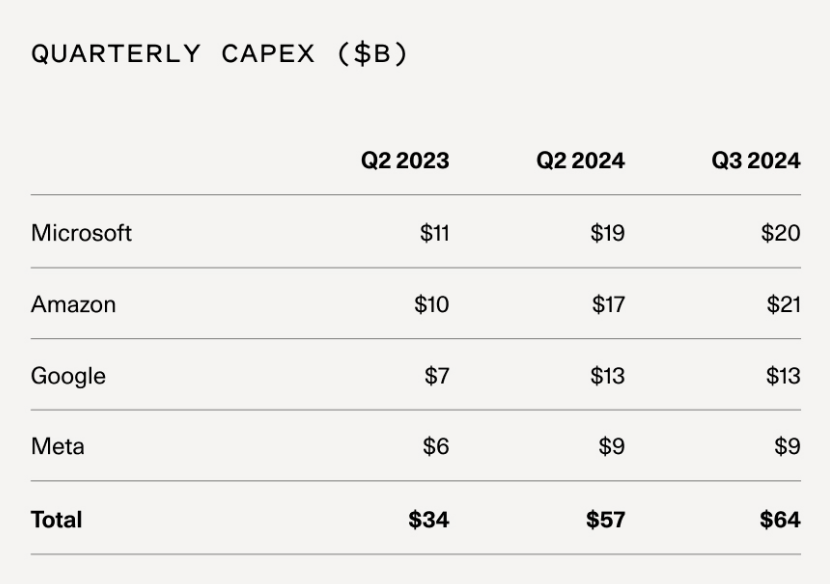 新的特定领域的AI搜索引擎将尽可能紧密地映射到其目标用户的心理模型。医生、律师和会计师的思维方式并不相同。随着我们在某个领域成为专家,我们提取知识和做出决策的模式开始分化。医生面对的是医学文献,律师面对的是判例法,投资者面对的是收益报告。我们在分析和决策这些知识的方式在每个领域都是不同的。 新型领域专用 AI 搜索引擎将尽可能紧密地映射到其目标用户群体的“心智理论” 上。医生、律师和会计师的想法各不相同。随着我们在特定领域成为专家,提取知识和做出决策的模式开始分化。医生面对医学文献,律师面对判例法,投资者面对财报。我们在这些知识上进行剖析、分析和决策的方式在每个领域都不同。 消费者与企业之间可能出现分化。作为消费者,我们有着大致相同的需求,因此 ChatGPT 实现了惊人的产品市场契合度。然而,作为专业人士,我们的需求各异。不难想象,每位知识工作者每天至少会使用两款 AI 搜索引擎——一款用于工作,另一款用于其他所有事务。 3. 投资回报率仍将面临挑战,而资本支出将在 2025 年开始趋于稳定。 我们曾探讨过 AI 的 2000 亿美元问题和 AI 的 6000 亿美元问题,这些探讨揭示了大型科技公司巨额资本支出的现状,以及与之不相匹配的终端用户收入,难以实现这些资金投入的回报。 进入 2024 年,大型科技公司对 AI 可能威胁其在云计算业务中的寡头地位感到紧张。正如我们在《AI 资本支出的博弈论》中所写,这些公司感到别无选择,只能大举投入以确保在 AI 未来中继续保持主导地位。如果他们不投入,他们将变得落后。 进入 2025 年,形势已发生剧变。大型科技公司牢牢掌控着人工智能革命的命脉。他们不仅掌控着为 AI 提供动力的大部分数据中心,还持有大型模型公司的重要股权,并且是众多新兴 AI 初创企业的最大支持者。 随着大型科技公司信心增强,我们认为,2025 年将是 AI 资本支出的稳定年(stabilization year)。若 2024 年是争相签署土地与电力协议的冲刺年,那么 2025 年则是执行年。项目已破土动工,这些公司将专注于按时按预算完成新项目。随后,他们需要将这些已安装的产能销售给客户,并与企业合作,助其利用新 AI 能力取得成功。 自从 ChatGPT 推出以来,资本支出(CapEx)水平大约翻了一番,我们可能在 2025 年看到趋于正常化。最新的 Q3 资本支出数据显示,这一趋势线已经在微软和谷歌内部开始稳定。亚马逊和 Meta 仍在增加资本支出,但可能在 2025 年初达到稳定状态。(虽然 Meta 在下图中看起来是平稳的,但该公司已发出 Q4 增加资本支出的指引)。来源:财报电话会议记录,公开文件