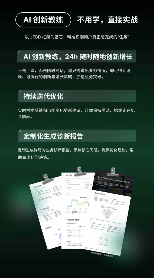 PART02 解锁专属于你的: AI 创新教练 “ AI 创新教练” 是一款基于 JTBD 理论开发的 AI 内容互动产品,致力于为创业者提供产品创新支持: 挖出真实需求帮助你拥有一张清晰的用户任务地图,为接下来的产品创新和策略部署打下坚实的基础。 做出靠谱创新真正创造让用户“愿意继续雇佣产品”的价值。无需在杂乱无章的创意中纠结,更快速落地可行方案,获得更聚焦的产品创新路径。 打出新兴增长在扎实的用户逻辑基础上,突破竞争壁垒,探索全新市场空间,助力持续增长。 AI 创新教练是创始人的标配 01