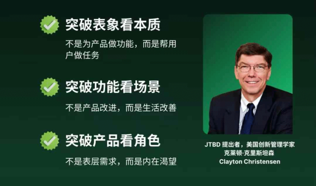 PART01 突破困局的金钥匙: JTBD方法论 JTBD(Jobs to Be Done)是一种用户驱动的创新理论,强调从用户任务出发设计产品。自克莱顿·克里斯坦森提出以来,该理论在数十年间已被全球数千家企业采用。 我的相关课程,自上线混沌大学以来超34万+人次付费学习,有幸成为了混沌大学最受欢迎的产品课程之一,并获得4.9分的高分评价。从 JTBD 理论出发,帮助创业者洞察真实需求,通过产品创新将模糊的市场信号转化为清晰商机。 在课程受欢迎的同时,我也在思考 JTBD 、真实商业案例与 AI 结合的可能性,突破时间与空间的门槛,以更高效便捷的方式帮助更多的创业者。让理论不再停留于“学”,而是进入日常业务的“实战”,“ AI 创新教练” 由此诞生。