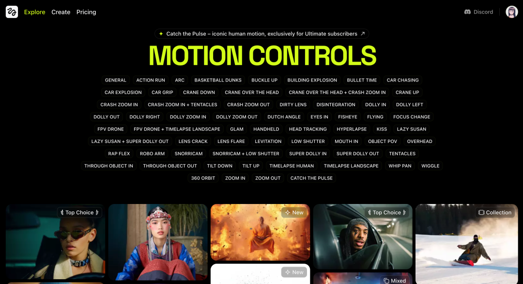 介绍完了老牌产品更新,来看看新产品的动向吧,说实话AI视频生成这么卷的赛道还有新产品出来着实想不到。Higgsfield AIHiggsfield AI 的联合创始人兼 CEO Alex Mashrabov 曾是 Snap 的生成式 AI 负责人,领导开发了 Snapchat 的 AR 滤镜、Cameos 功能以及 MyAI 聊天机器人等产品。他与联合创始人 Yerzat Dulat(生成式视频领域的 AI 研究员)共同创立了 Higgsfield AI。该产品的特点是提供了超过 50 种预设镜头动作,如“子弹时间”、“超级推拉镜头”等,增强视频的电影感,使用时支持混合多个镜头效果。访问地址:https://higgsfield.ai/
