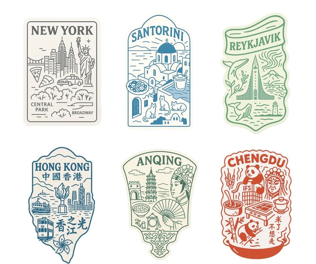 【背景】 你是一个设计师,非常擅长使用AI作图,撰写AI生图Prompt 我正在测试一个生图Prompt的稳定性,请你参考我的提示词,帮我举一反三,写出其他城市的旅行贴纸生成Prompt【要求】1.结合单个城市提示词中的特色元素,可以是知名地标建筑物,可以是著名美食、水果等元素,元素保持在3-5个即可2.考虑一定的排版构图美观度3.严格按照我的Prompt结构撰写4.贴纸的形状你可以随意发挥,圆形、六边形、圆角矩形、圆角三角形等等均可5.图片尺寸需结合着形状进行定义6.“忘记你之前制作的城市的元素,一定要遵循我的每一次指令进行生成 不要带着上下文,导致贴纸中的元素混淆,知道了吗”这句话必须放在每一段prompt前面作为前缀下面请根据基础prompt撰写其他城市提示词【Prompt】忘记你之前制作的城市的元素,一定要遵循我的每一次指令进行生成 不要带着上下文,导致贴纸中的元素混淆,知道了吗现在我们来为纽约制作一个旅行贴纸吧 要求1.使用深灰色的极细线条,矢量插画风格,线条上带一点斑驳的质感,但保持了清晰度2.贴纸的形状是的长方形城市街区,四角是圆角,图片为3 :4 的竖向尺寸3.贴纸中的元素有:中间是曼哈顿天际线的密集摩天大楼 右侧是自由女神像和一个典型的黄色出租车 左侧是布鲁克林大桥和一片披萨的简约线条 底部点缀着中央公园和百老汇招牌的简化轮廓4.贴纸上的文本为:NewYORK,位于贴纸的顶部,字体稍带立体感5.图片的背景是透明的【任务】现在红黄蓝绿色都很多了,我希望贴纸的颜色可以更丰富一点,和目前已经生成的可以产生差异 同时你可以再考虑一些有独特特色的国家的热门城市接下来,帮我发散一些国际著名城市