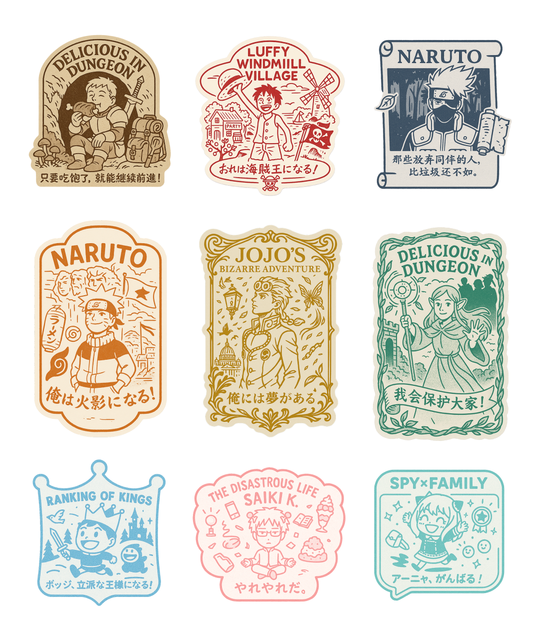 继续探索,我发现,这些提示词还能玩出动漫角色&名台词系列~ 你可以输入你喜欢的动漫让GPT帮忙生成对应的角色和著名台词进行生成。可以参考的提示词也放在这里啦:忘记你之前制作的城市的元素一定要遵循我的每一次指令进行生成不要带着上下文,导致贴纸中的元素混淆,知道了吗现在我们来为乔鲁诺·乔巴拿制作一个旅行贴纸吧要求1.使用黄金叶绿色的极细线条,矢量插画风格,线条上带一点斑驳的质感,但保持了清晰度2.贴纸的形状是意大利藤蔓花纹轮廓,图片为3 :4的竖向尺寸3.贴纸中的元素有:中间是乔鲁诺身穿黄金西装,抬头仰望,背景是飞舞的黄金叶片与远处的圣彼得大教堂剪影 右侧是蝴蝶与黄金风暴轨迹 左侧是破碎的街灯和鸽群 底部点缀着乔鲁诺台词:“オレには夢がある”以华丽优雅字体排版4.贴纸上的文本为:JOJO'S BIZARRE ADVENTURE,位于贴纸的顶部,字体为复古繁复英文字体5.图片的背景是透明的