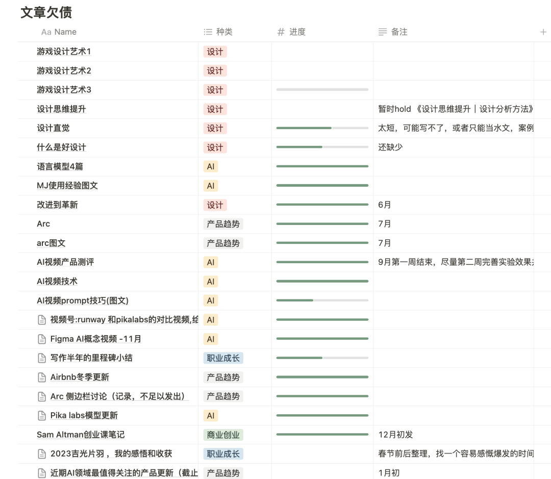 开始更系统的学习和思考关键词:写作5月,AI成为全网最火热的话题,比起看二手整理的资料,我更希望学习到一手的实践经验,产出自己的见解和思考。正巧,当时的我也正准备系统性研究Arc的设计思路。突然像是被打通了任督二脉一般,我想通了自己要在业余时间做些什么。我意识到自己擅长系统化的学习和整理,也喜欢以文字为表达方式,那就可以将所有有价值的学习内容转化为思考,整理成长文输出。毕业后,我一直坚持在知乎上发设计、产品书籍的学习笔记,也一直想要着手写些什么,却总觉得缺乏深刻的体会和感悟。但这一次我好像终于想清楚了,在Notion表格中哗啦啦写了一大堆待研究的工具、待写的话题。