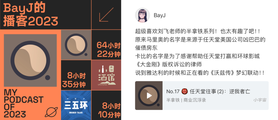 播客23年年度播客一如既往的是刘飞和潇磊的《半拿铁|商业沉浮录》从任天堂系列、硅谷史话、人工智能风云录到马斯克系列,听的津津有味如痴如醉,其中苹果简史和22年底看完的《沃兹传》《乔纳森传》也惊喜的联动起来。商业故事、播客脱口秀的形式让我在轻松搞笑中拓宽了知识面。