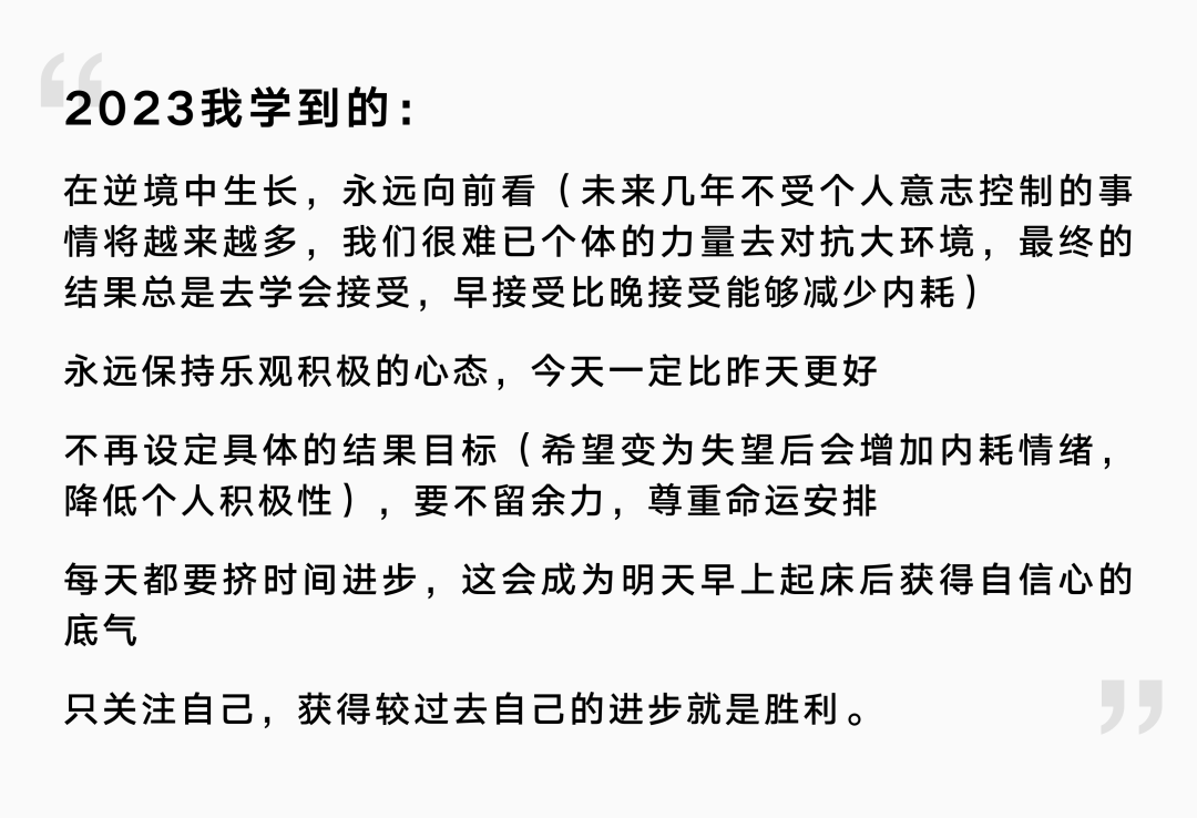 结语 & 24年愿景我深知自己是个笨拙、慢节奏的人,并不擅长快速取得成果、大方秀肌肉。不过我也感谢自己同时拥有执着和坚韧的性格特征,才让我在很多艰难时刻坚定内心所想,坚定向自己所描绘的未来前进,大胆放弃前行路上那些有吸引力但我并不想要的果实。24年,希望在大命题的探索上持续坚守,看到自己的阶段性进步,并和大家分享。